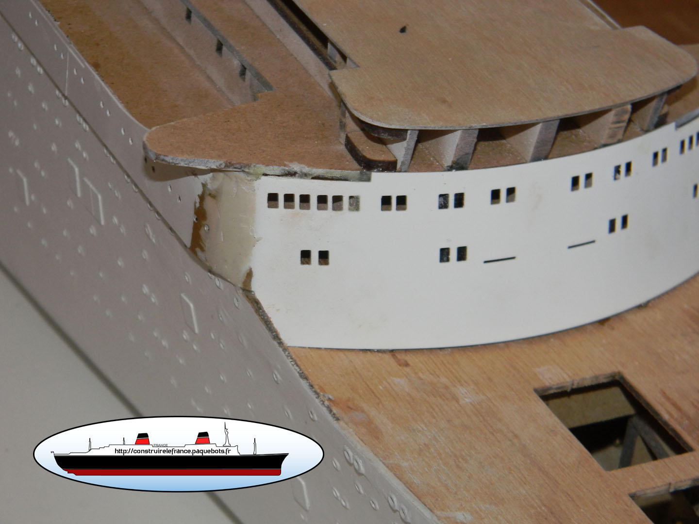 | Je bouche donc les écarts entre la façade et les parties latérales avec du mastic. Puis j’effectue un ponçage afin d’obtenir une forme arrondie. |
