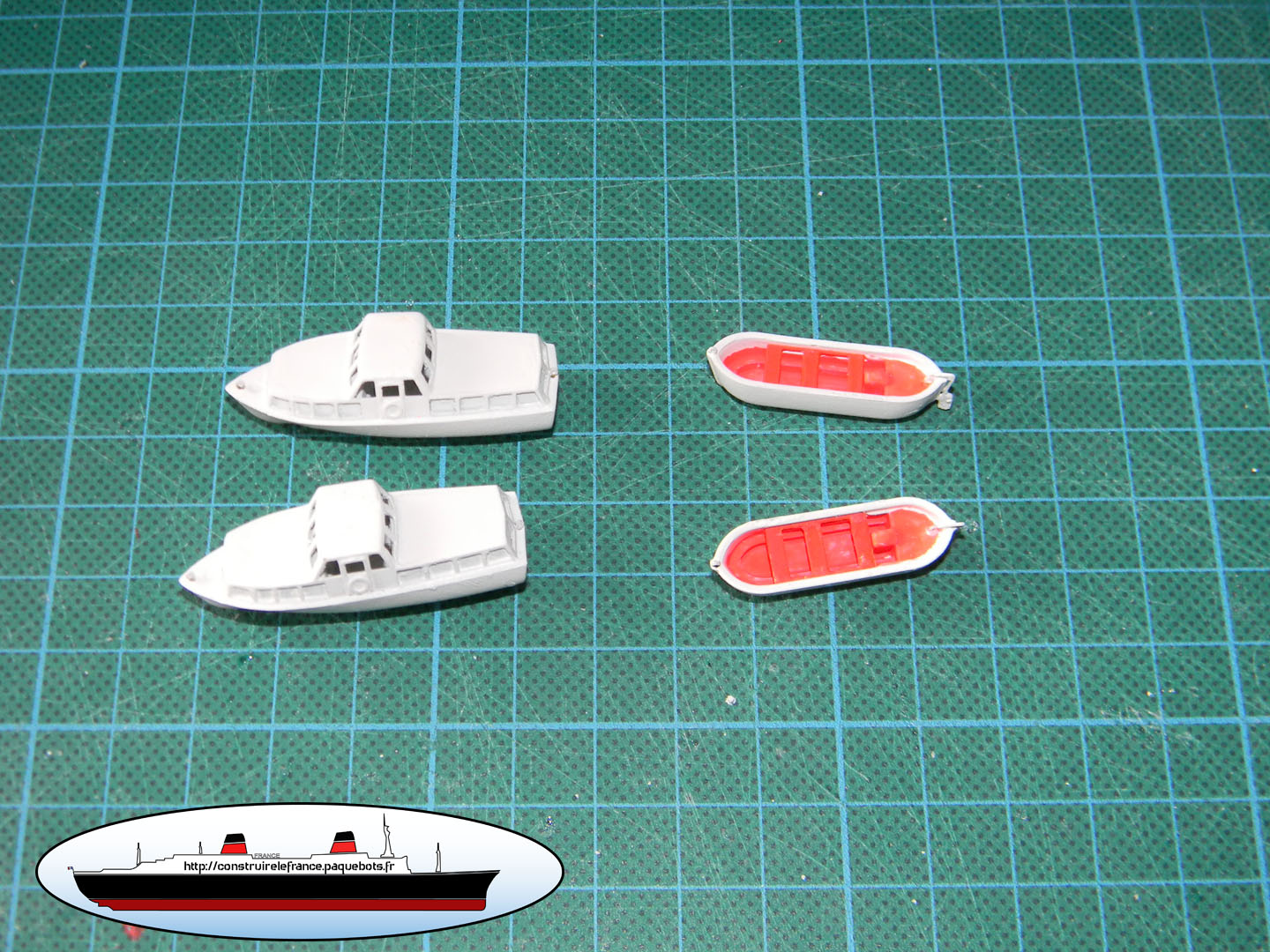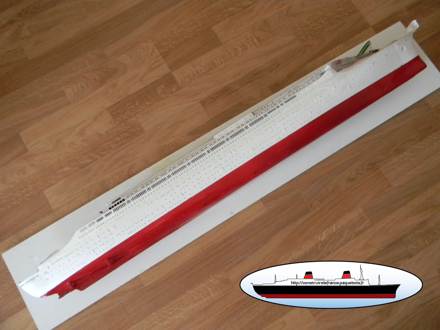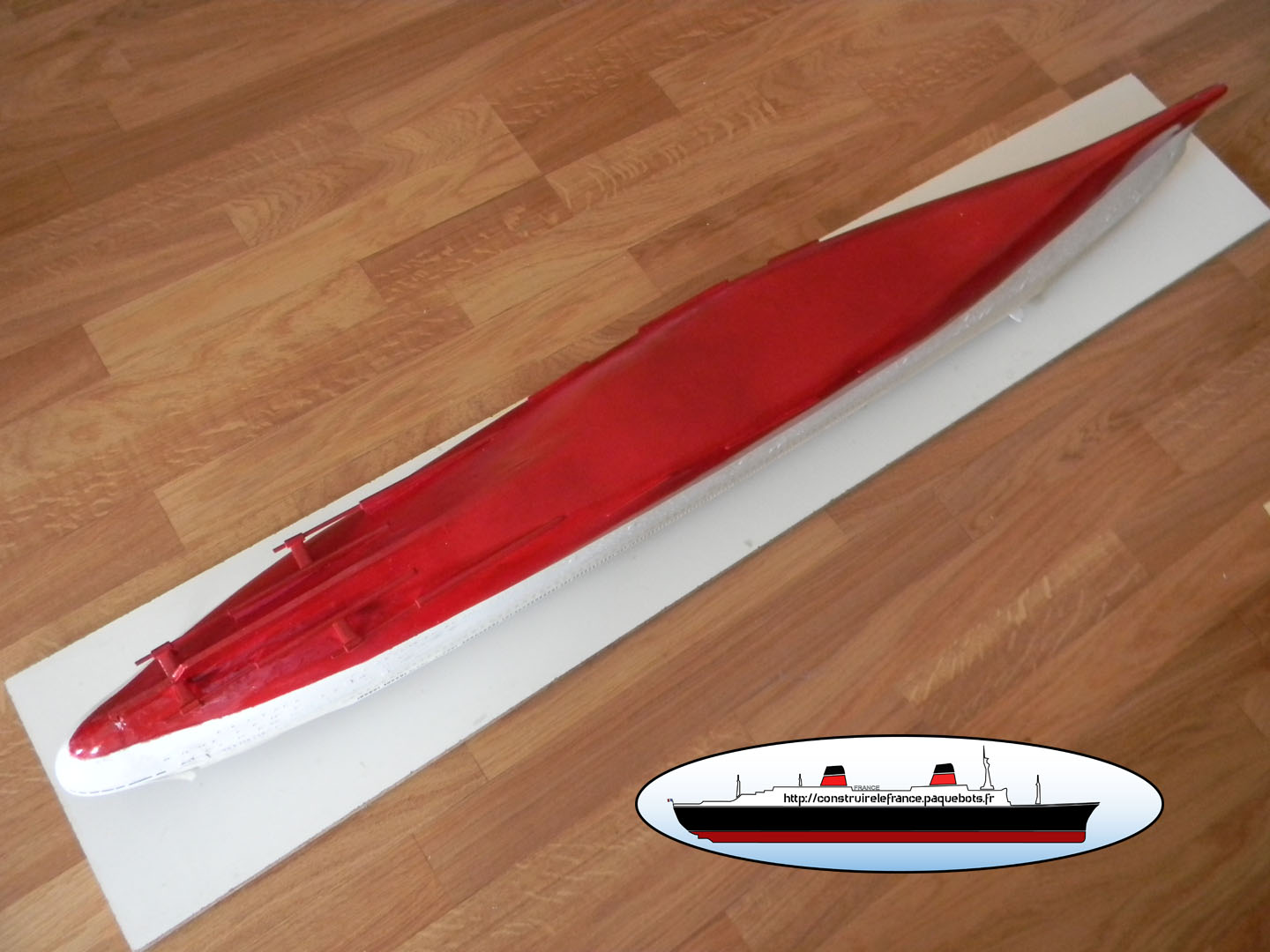 | La seconde étape consiste à peindre en rouge les oeuvre vives (partie sous l’eau) de la coque. Pour la couleur j’ai pris de la bombe rouge sang de chez Castorama. Ce rouge est très proche de la maquette du France de chez Dinkytoys. | ![]() ![]() |