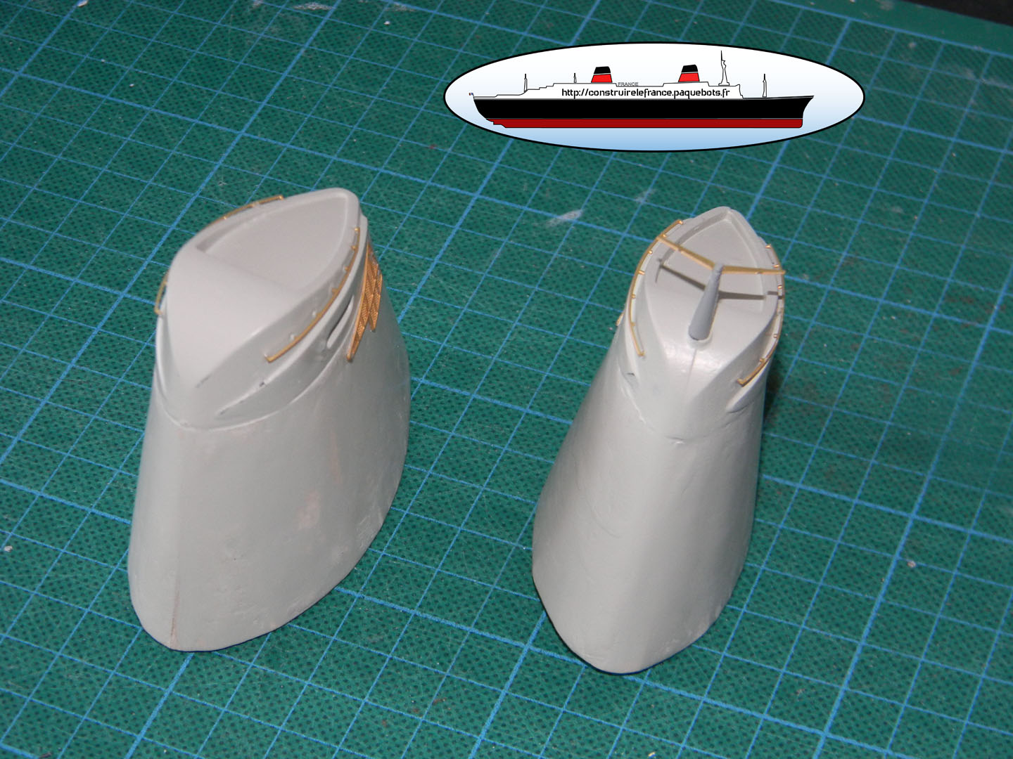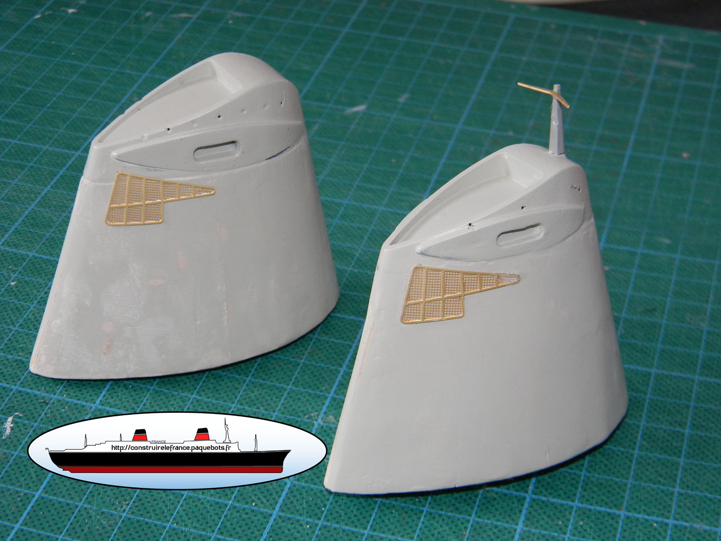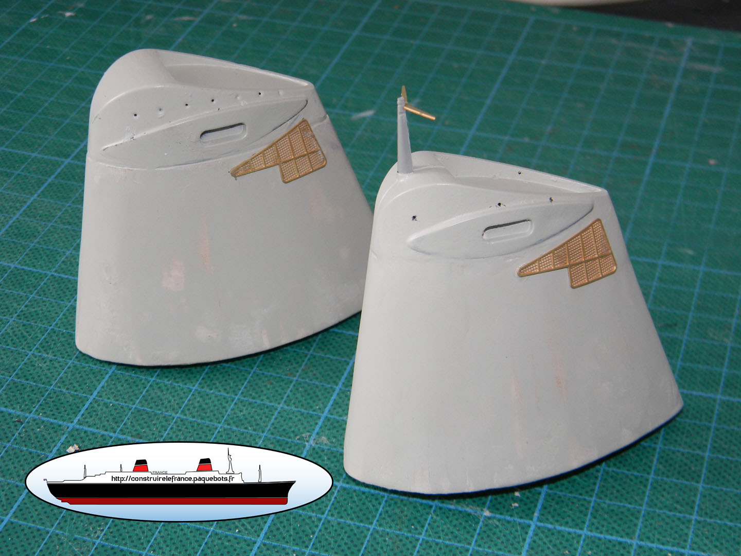 | Ensuite, les grilles 413 sont posées sur les 2 cheminées. Avant de les poser je conseille de les incurver légèrement afin d’en faciliter le collage.